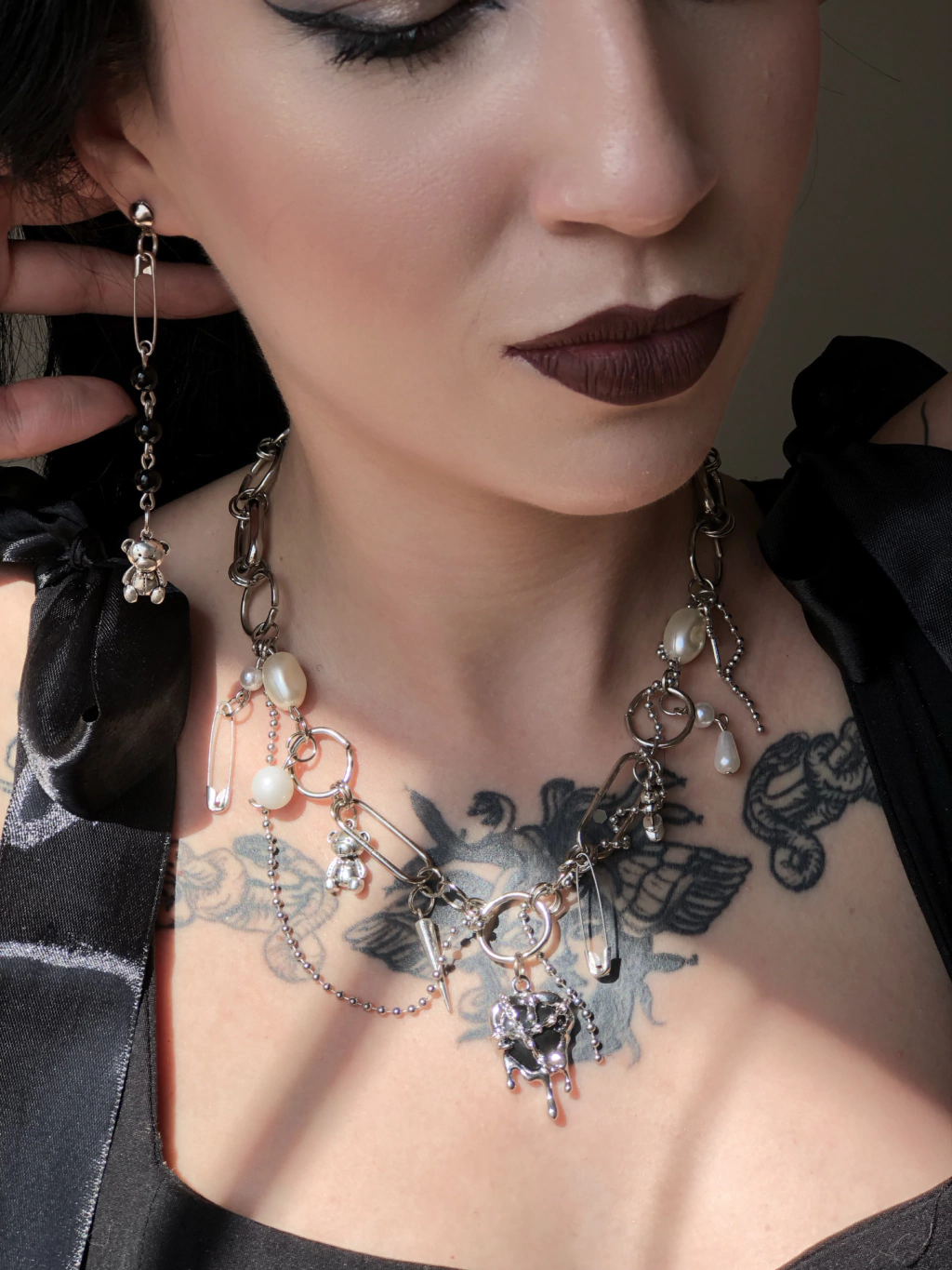 O brinco Little Bear é um brinco assimétrico, de um lado ele contém um alfinete, uma corrente de pérolas pretas feita à mão e um pingente de ursinho, do outro somente uma pérola preta, um alfinete e o pingente de ursinho. É uma peça super fofa para dar aquele toque charmoso para o seu look!