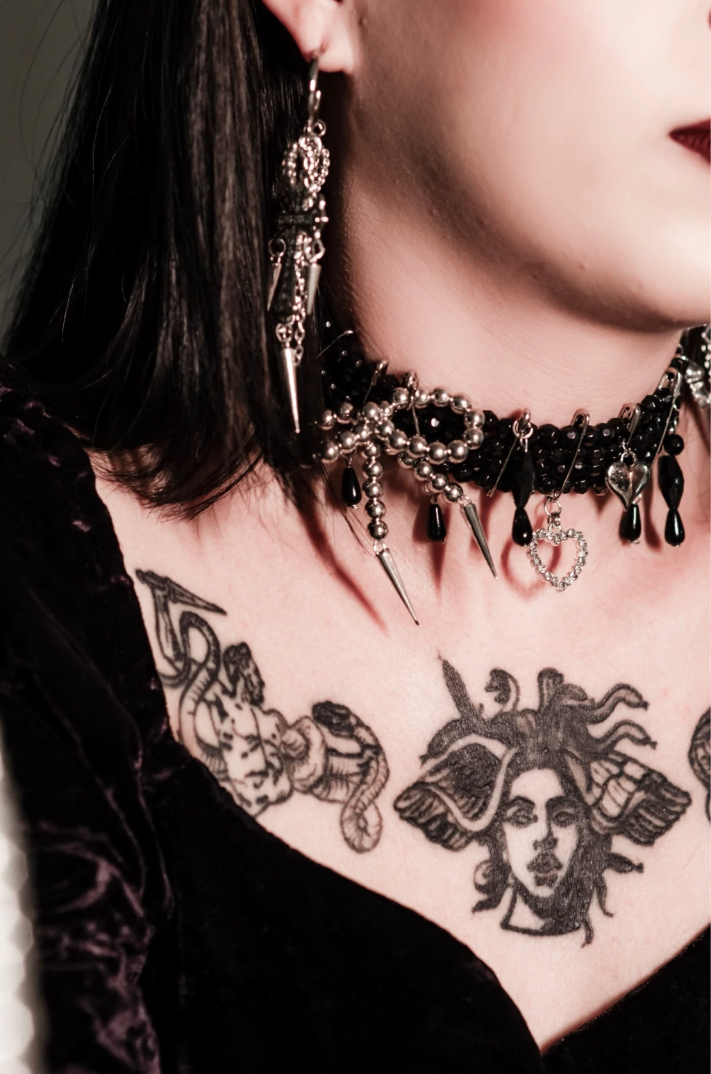 A Nocturne é uma choker que já entrega atitude só de olhar. As contas pretas formam uma base intensa e super bonita no pescoço, e os pingentes dão aquele contraste perfeito — tem laço de bolinhas, spikes, gotinhas escuras, coração liso e até um coração cravejado que brilha do jeito certo.