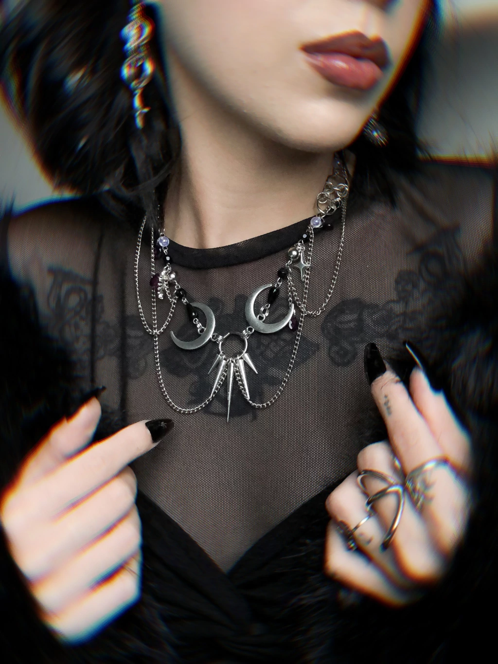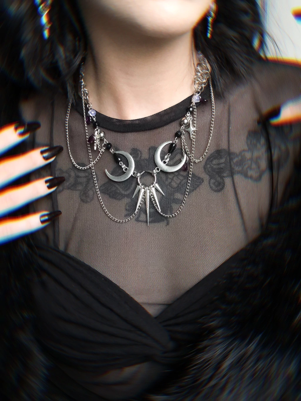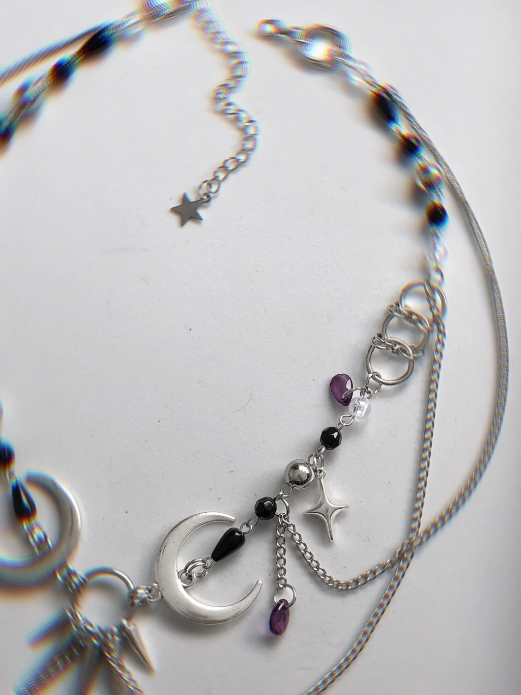 Feito em metal prateado com detalhes em preto e roxo, ele tem camadas, texturas e pingentes que juntam formam uma peça repleta de magia.