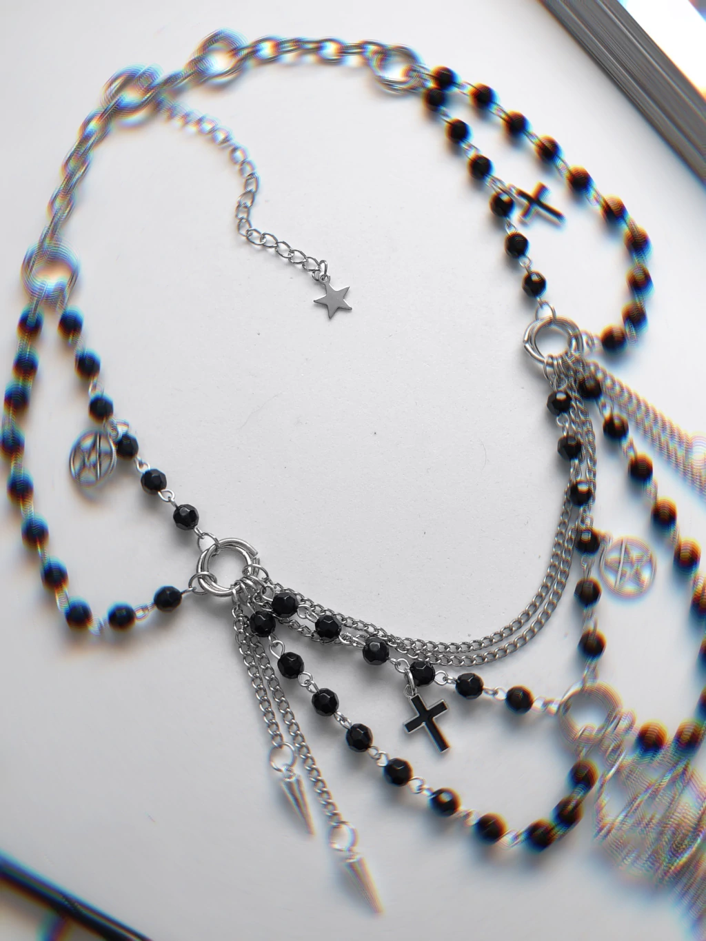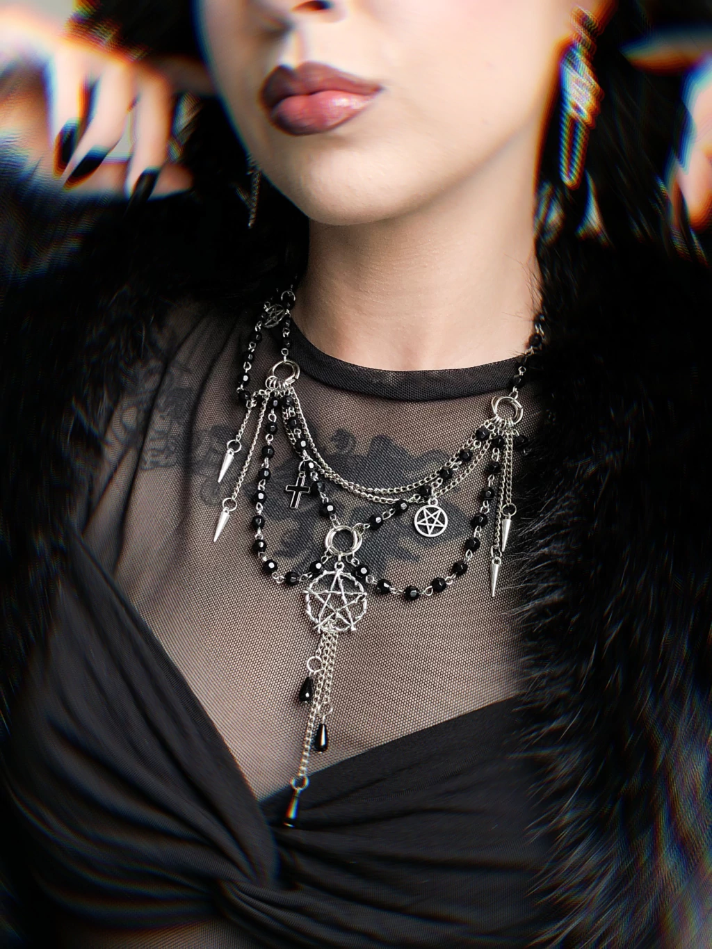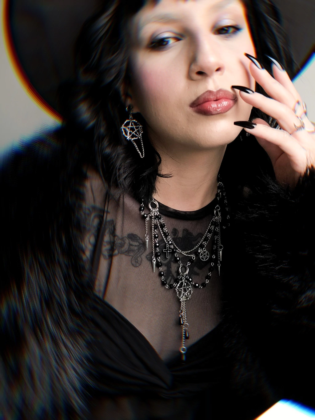 Um colar que carrega a essência sombria e poderosa de uma verdadeira bruxa moderna. O Wicked Witch mistura camadas de correntes com contas pretas, cruzes, pentagramas e spikes que trazem aquele ar gótico irresistível. O destaque fica no pingente central em forma de pentagrama, finalizado com gotas negras que caem como se fossem feitiços escorrendo.