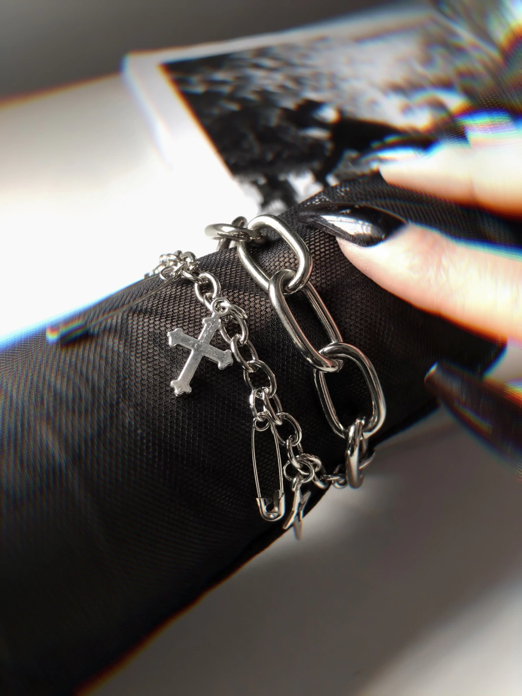 A Pulseira Spells conta com correntes de duas expessuras, uma mais grossa e super marcante, com elos bem robustos e outra menor repleta de pingentes como, alfinetes, crucifixos, pentagramas e estrelas. Ela fica perfeita sozinha mas também é ótima para compor com outras pulseiras, pois sabemos que um mix de pulseiras babado pode fazer tudo pelo look né?